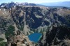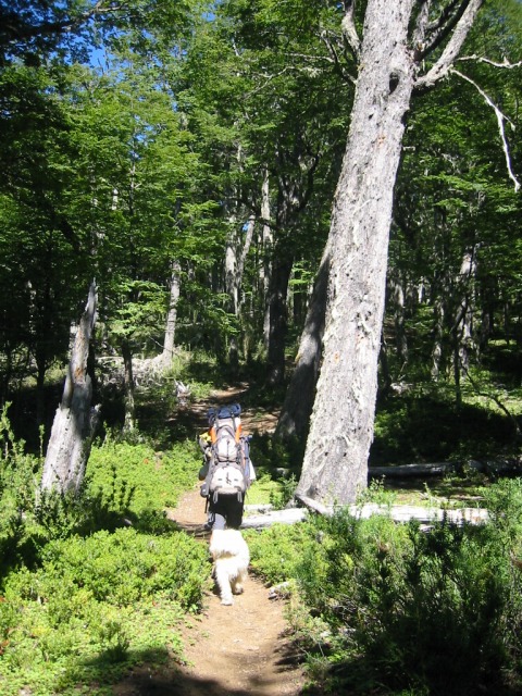 この日はほぼずっと上り。木々の向こうにすけて見える東側の山"Piltriquitron"の見え方で、どのくらい登ってきたかがわかる。 池からはゆるやかな上り+平坦な道になって比較的楽チン。 |