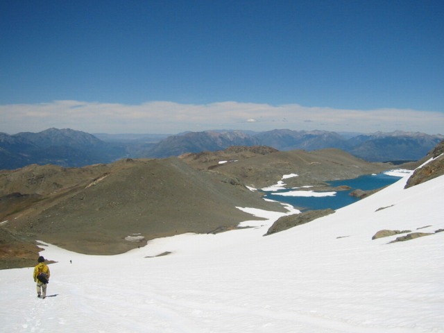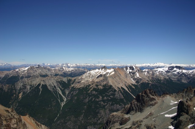 る。 ここから私達はCerro Lindoと思われる山の頂上目指して登り始めた。 15分程度で頂上につくと、西側(チリ側)に180度広がる雪をかぶる山々が。北にはトロナドール山も見えている。すごい眺めだ! |