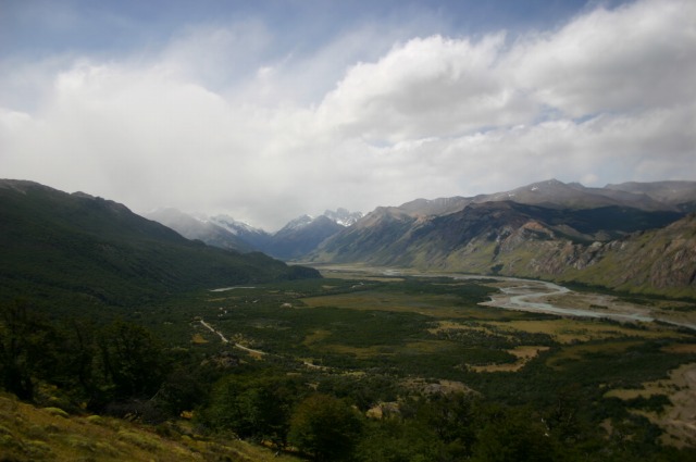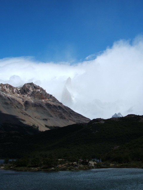 一日雨が降っていたが、ここにきて少しの間だけ、雲の隙間からFitz Royが顔を出す。 湖の向こうに山、しかも、ここからなら氷河も一緒に見えるので、かなり素敵であ